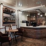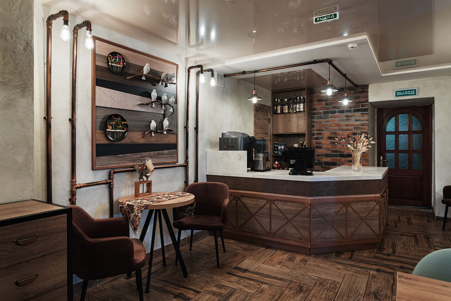 При оформлении барного зала было отдано предпочтение стилю лофт с элементами стимпанка. Из труб, пружин и шарниров создан настенный декор. Детали индустриальной эпохи смягчают деревянное панно с нежными птичками, приглушенные тона в мебели и отделке стен. Светильники под старину с лампами накаливания напоминают керосиновые лампы или свечи. В интерьере просматривается стиль ретро, но он не копирует обстановку прошлых лет.